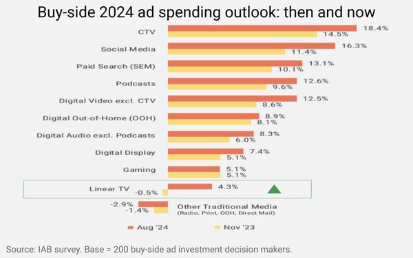 Явно желая подчеркнуть положительную динамику рынка интернет-рекламы, в IAB для сравнения попросили агентства оценить и рост расходов на рекламу в эфирном ТВ и других традиционных медиа. Хотя участники опроса и зафиксировали рост этого рынка, но ожидаемо назвали значительно более низкие темпы роста. По их данным, на эфирное ТВ в 2024-м рекламодатели потратят всего на 4,5% больше, чем в 2023 году. Правда, в ноябре 2023-го заявлялось, что эти расходы уменьшатся на 0,5%.