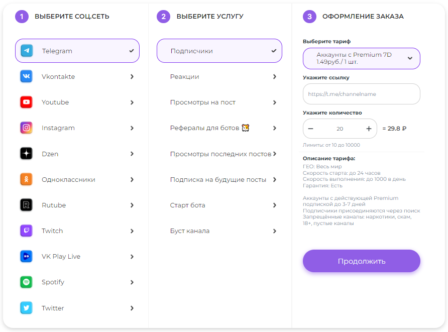 Разберемся, кто такие боты — это аккаунты, которые автоматически выполнят заказанное действие в сервисе накрутки, они выглядят как обычные пользователи с именем и аватаркой, какой-то историей активности в Telegram. Боты бывают разного качества, например некоторые из них есть с активной Premium подпиской — в 2024 году это самое хорошее качество аккаунтов.