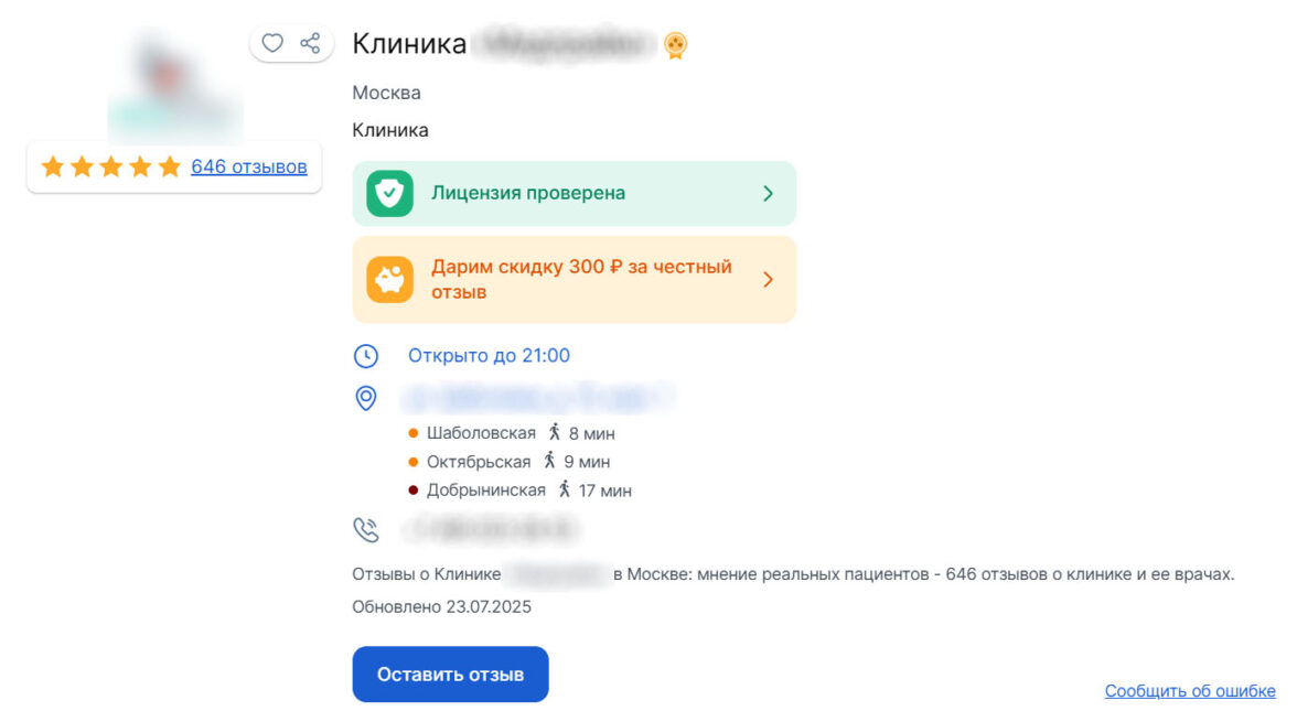 Обновление профиля должно стать рутиной: сменился врач — обновите карточку, добавились услуги — отразите это в описании.