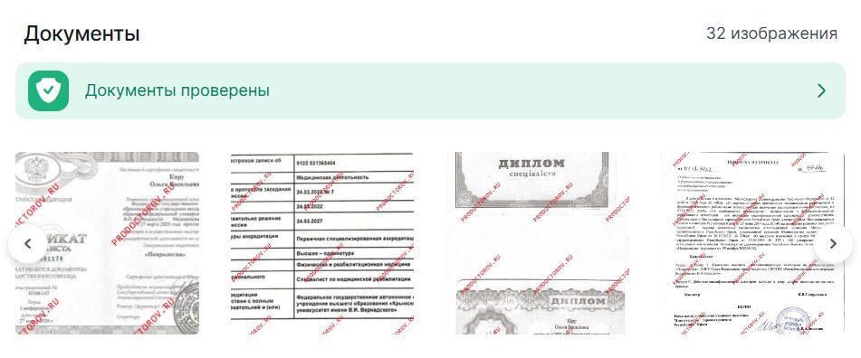 Информация, подтверждающая образование: дипломы, сертификаты, удостоверения о повышении квалификации и прочие документы. Пациенты ценят, когда врач открыто рассказывает свою профессиональную историю.