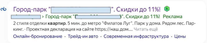 Исследование поисковых объявлений показало, что чаще всего в заголовке объявлений застройщиков фигурирует связка «название ЖК + ключ “квартира” + локация». Это удачный вариант, и вот почему:
