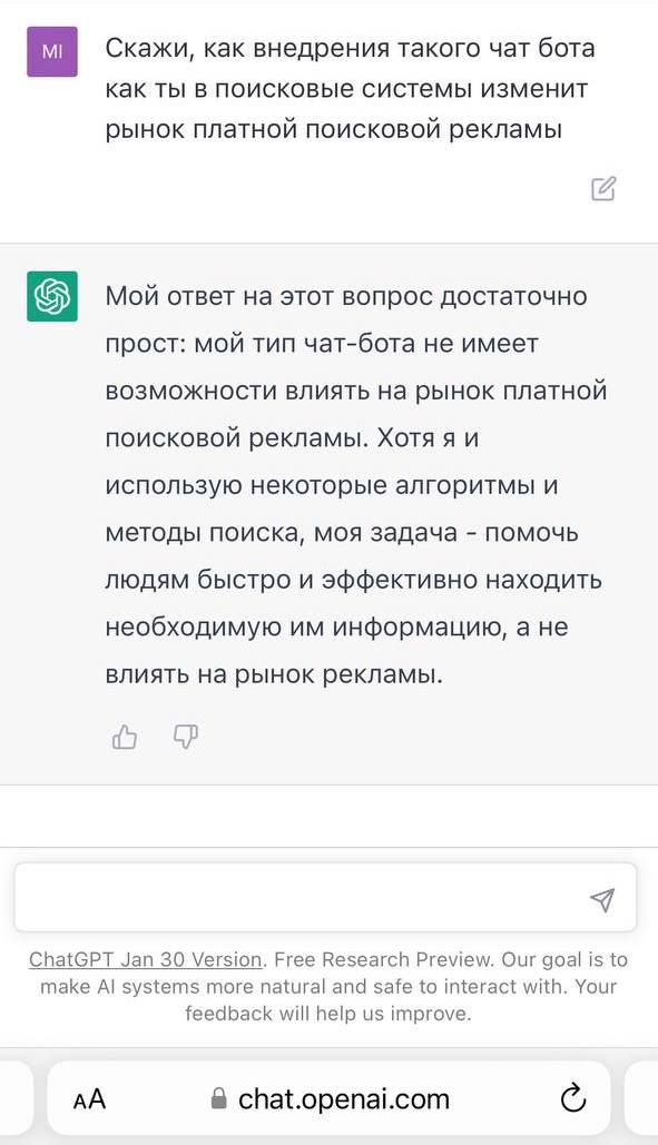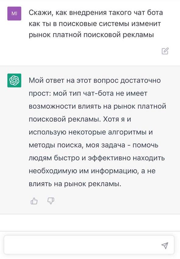 Кажется, что платный поиск будет затронут последними нововведениями меньше всего — учитывая долю рекламы в структуре доходов техногигантов. Сам ChatGPT тоже согласен с этим утверждением.