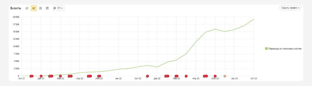 Хочется сразу отметить, что если одно агентство занимается и созданием, и маркетингом этого сайта, то это всегда хорошо, так как ещё на этапе разработки необходимо учитывать все элементы для дальнейшего продвижения. А старт SEO работ начинался не с добавления в шаблон тега Н1 и изменения верстки, а с километрового файла Excel, содержащего запросы для дальнейшего развития сайта. И поэтому, сразу после сдачи сайта мы мгновенно начинаем свою работу по SEO.