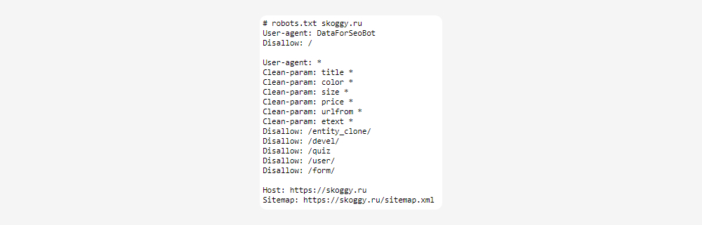 Поэтому быстро проходимся по файлу, закрываем от индексации технические папки, выставляем значение основного домена Host и путь к карте сайта. В дальнейшем необходимо проводить работу по анализу УРЛов в вебмастере, которые попадают в индекс и по необходимости их закрываем. Делается это для того, чтобы устранить дубли продвигаемых страниц. В нашем случае мы: