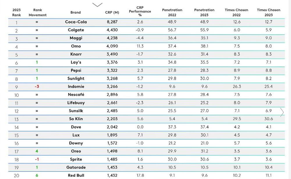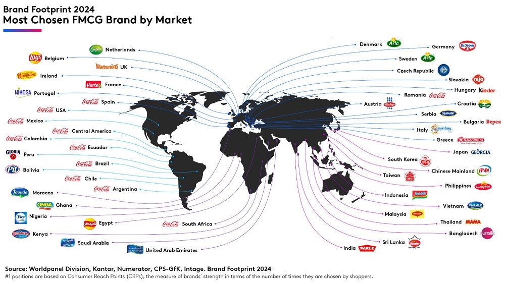 В пятерку самых популярных брендов в мире вошли Coca-Cola, Colgate, Maggi, OMO и Knorr. Coca-Cola остается самым популярным брендом в мире 12-й год подряд. За год Coca-Cola получила 8,3 млрд «точек контакта». По проникновению лучший результат показал Colgate. Проникновение этого бренда выросло на 2,6% за год, этот бренд покупают 60% мировых домохозяйств. Никакой другой FMCG-бренд пока не может преодолеть отметку 50%.