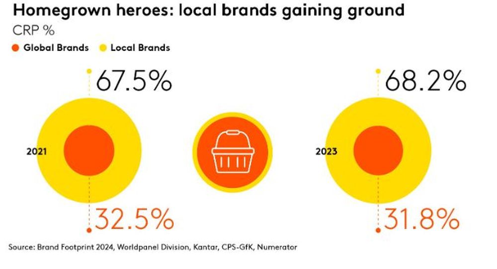 Соотношение расходов на крупные мировые бренды и локальные торговые марки продолжает меняться. На мировые бренды в 2023 году пришлось 30% всех покупок, на локальные — 47% (+1%), на собственные торговые марки ритейлеров — 22,7% (+0,5%).