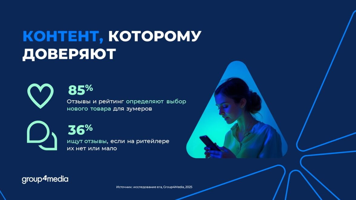 Однако самый мощный инструмент — отзывы. Именно хороший рейтинг и отзывы определяют выбор товаров для 85% зумеров, а 36% готовы искать дополнительную информацию вне ритейлера, если мнения о товаре показались недостаточными для принятия решения о покупке. Однако сами зумеры неохотно оставляют след на ритейлере: 80% опрошенных зумеров не пишут отзывы вовсе — брендам необходимо предпринимать дополнительные усилия, чтобы мотивировать Z-тов поделиться отзывом в месте совершения покупки.
