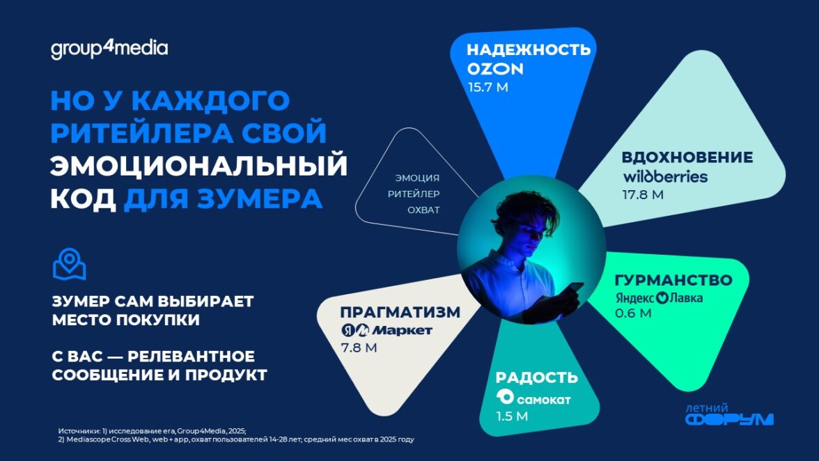 Вовлекайте поколение Z на их территории. Наше качественное исследование показало: зумер приходит в еком с конкретным запросом, и в зависимости от миссии и даже своего настроения выбирает площадку, на которой он готов совершить покупку в моменте. Топ любимых ритейлеров у него уже сформирован, и выбор происходит среди них. Например, за электроникой Gen Z с большей вероятностью пойдут на OZON, который в их глазах имеет статус максимально надежной платформы для таких покупок. Если необходимо что-то из категории одежды и красоты — в приоритете Wildberries (в целом WB — лидер по абсолютному количеству пользователей-зумеров и любимый ритейлер, по словам самих Gen Z). За крупной покупкой, например, бытовой техникой, зумер отправиться на Яндекс Маркет — искать лучшие цену и условия доставки, а если захочет перекусить или побаловать себя — откроет раздел готовой еды в «Лавке» или закажет «Самокат».