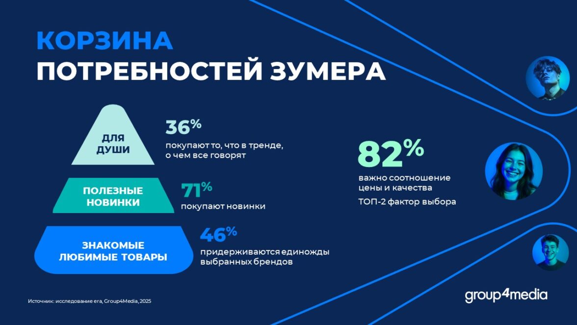 Покупательскую корзину Gen Z можно представить в виде аналога пирамиды Маслоу, где базу покупок составят знакомые и любимые товары (46% придерживаются любимых брендов), в середину лягут новинки (71% охотно их выбирают), а на вершине расположатся товары «для души» (36% откликаются на актуальные тренды или лимитированные товары). При этом, о какой бы категории ни шла речь, зумеры достаточно прагматичны, в основе покупок всегда лежит соотношение цена/качество.