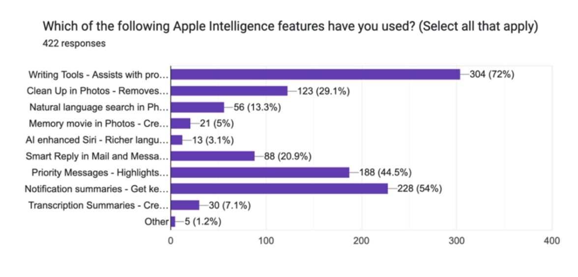 Владельцы iPhone чаще всего использовали «Инструменты для письма» (Writing Tools) — проверка текста на ошибки, переписывание, конспектирование, упорядочение и составление текстов. Это делали 72% пользователей ИИ-функций. На втором месте — функция «Конспектирование уведомлений» (Notification summaries), представляющая самую важную информацию в сжатой форме. Ее использовали 54% любителей ИИ-функций. На третьем — «Приоритетность сообщений» (Priority Messages) — сортировка электронных писем по важности — 44,5%. Очищали свои фотографии с помощью функции «Очистка» (Clean Up) 29,1% пользователей ИИ-функций. Лишь каждый пятый (20,9%) использовал функцию «Смарт-ответ» (Smart Reply), позволяющую ИИ сгенерировать электронное письмо, чтобы пользователю осталось только утвердить его. Остальные возможности искусственного интеллекта оказались еще менее востребованы.