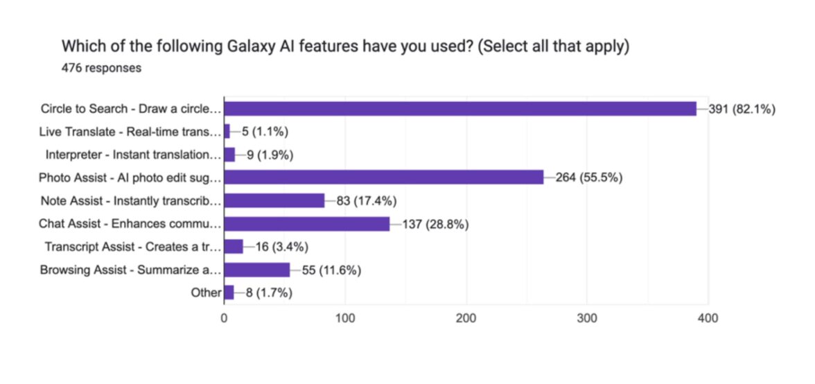 У хозяев техники Samsung, использовавших ИИ-функции, наибольшей популярностью пользовалась функция «Обвести и найти» (Circle to Search) — поиск объекта, обведенного пальцем или пером S Pen на экране. Ее задействовали 82,1% пользователей ИИ-функции. «Ассистент по фотографиям» (Photo Assist) для обработки фото использовали 55,5% любителей функций искусственного интеллекта. «Ассистент по чатам» (Chat Assist), помогающий редактировать сообщения — 28,8%. «Ассистент для заметок» (Notes Assist), который переводит аудио в текст и конспектирует его — 17,4%. «Ассистент по просмотру» (Browsing Assist), резюмирующий и переводящий веб-страницы — 11,6%. Остальные ИИ-функции менее популярны.