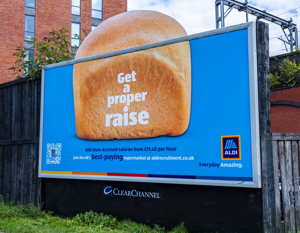Привлечет ли рекламный щит Aldi внимание соискателей? Outdoor-кампания ритейлера отмечает повышение заработной платы сотрудникам магазинов на 40 пенсов в час.
