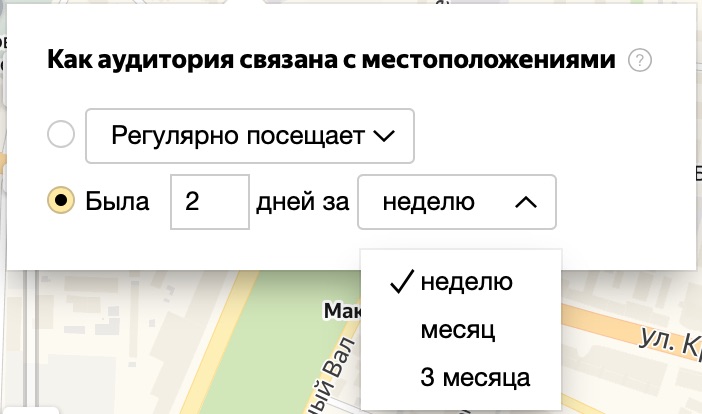 2. Посещает с определенной периодичностью и частотой. Например, можно настроить включение в аудиторию только тех, кто бывает в указанной локации не менее двух раз в неделю.