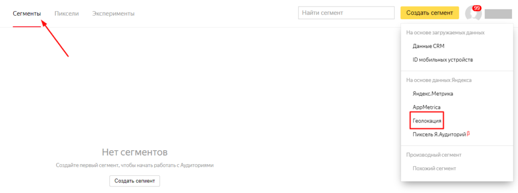 Создайте новый сегмент в Яндекс Аудиториях и выберите опцию «Геолокация»: