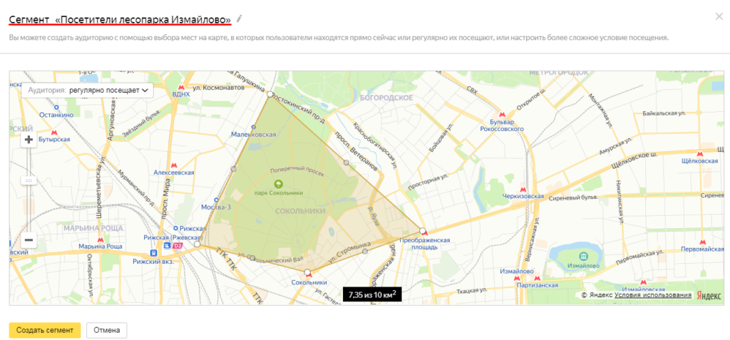 на карте можно отмечать несколько полигонов. Максимальное количество полигонов в 1 аудитории (сегменте) — 10;