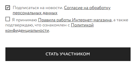 3. Подтверждение согласия на обработку персональных данных — согласно 152-ФЗ, собирать и обрабатывать какие-либо персональные сведения о людях можно исключительно с их согласия. Поэтому и нужна соответствующая возможность на сайте. Чаще всего используют чек-боксы, где нужно поставить галочку — без этого нельзя оставить заявку или зарегистрироваться.