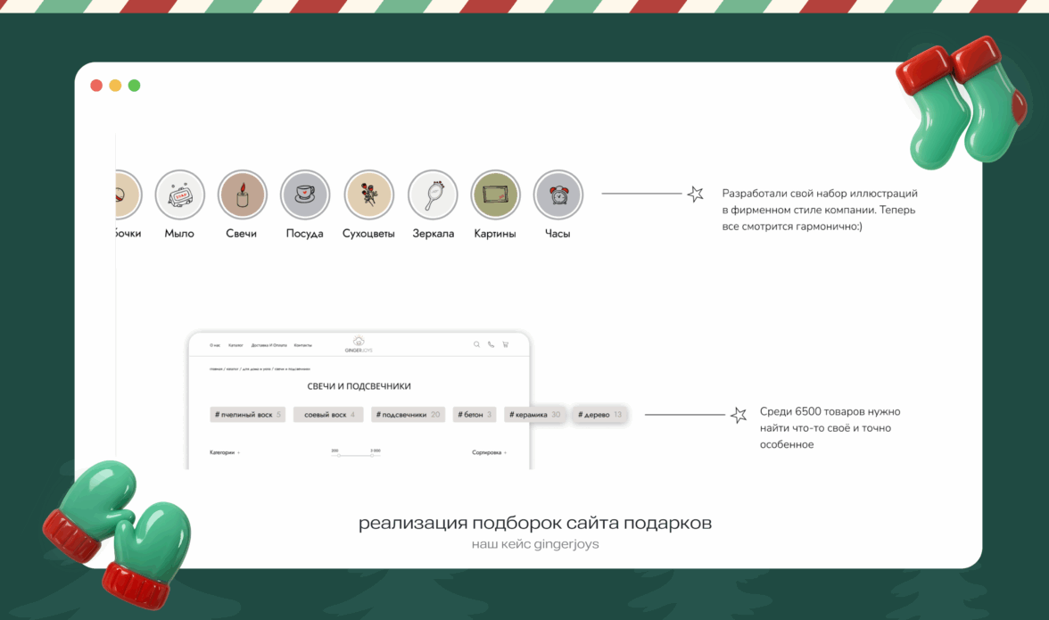 Многие клиенты ищут готовые решения, поэтому полезно создать отдельные подборки, статьи и лендинги: «подборка подарков маме», «подарки до 2000 ₽», «подарки коллегам» и т.д. Эти страницы можно продвигать в рекламе и использовать в рассылках. Стоит обновить и SEO: добавить сезонные запросы, уточнить заголовки, скорректировать тексты под то, что покупают в декабре чаще.
