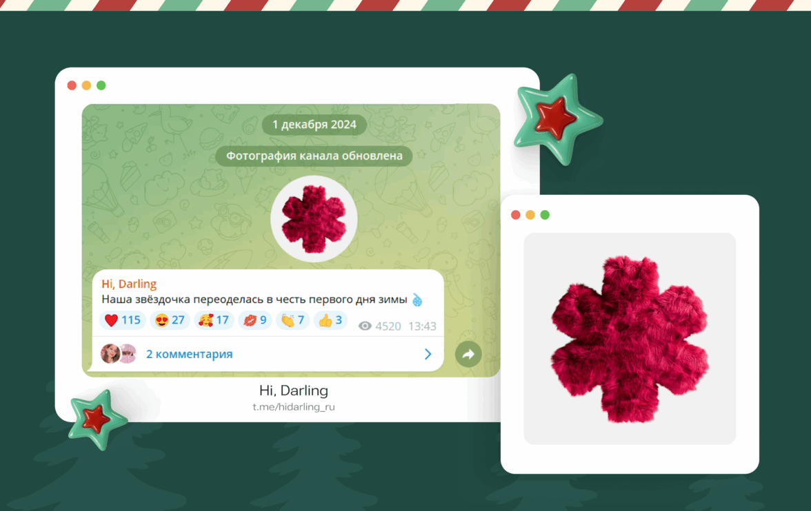 Продолжают работать и пушистые элементы — надутые, как зимние куртки или штаны из детства, те самые, что делали «фьють-фьють». В этом направлении показал себя пример бренда косметики Hi Darling, где обложку адаптировали под текстуру пушистой шубы. Такой приём делает визуал заметнее в ленте, особенно когда вокруг много стандартной праздничной графики.
