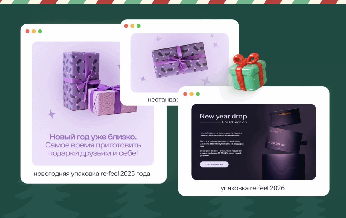 Адаптируйте оформление под стиль бренда. Такой подход удерживает внимание заметнее шаблонных открыток, универсальных бантов и однотипных «ёлочных» визуалов, которые теряются в сезонной коммуникации.