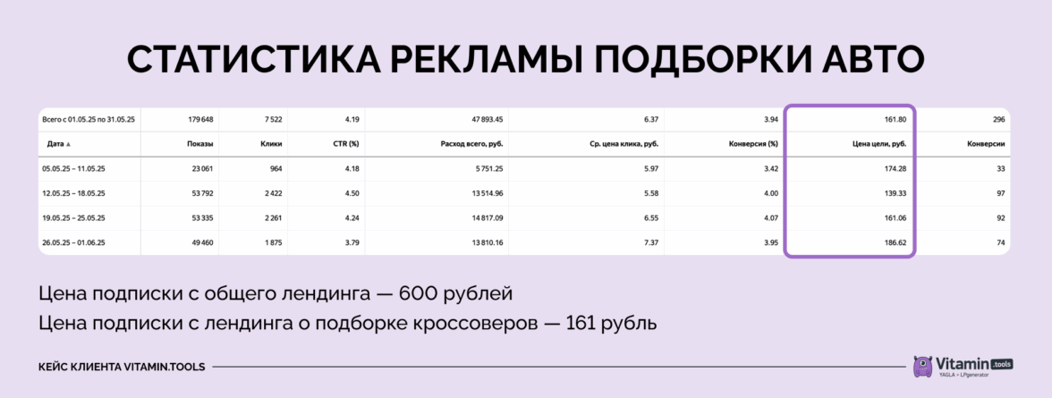 Для товарной ниши с высоким чеком это отличные показатели. Средняя цена подписки стала в 3,5 раза ниже.