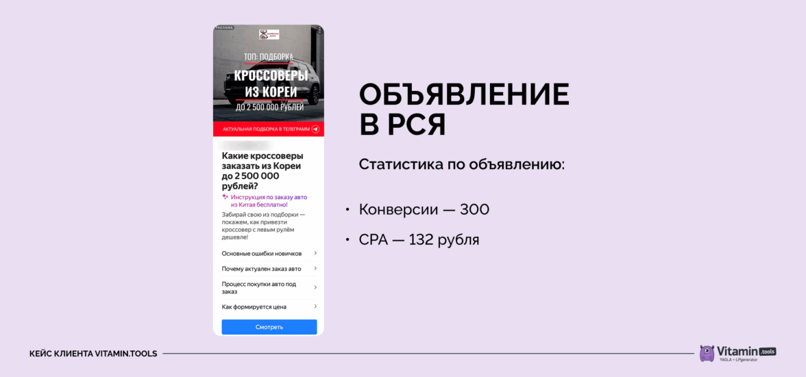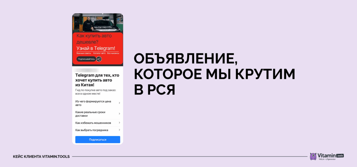 В заголовках объявлений писали ключевые запросы «купить авто» и «заказать авто». Так алгоритмы точнее «понимали», кого мы ищем. Например: «Telegram для тех, кто хочет купить авто из Китая» и «Как заказать авто из Кореи? Разбираем в Telegram».