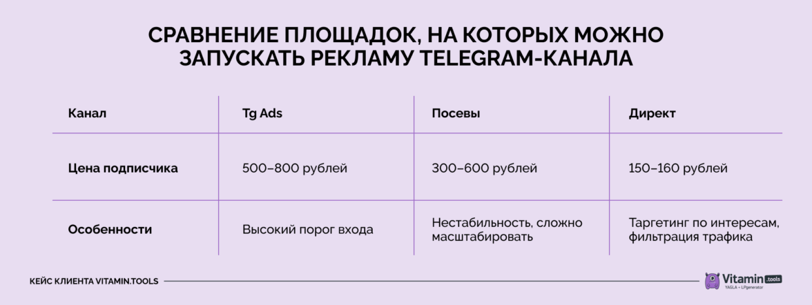 Telegram хорошо работает как канал продаж в нишах с длинным циклом сделки. Здесь можно постепенно прогревать аудиторию. У заказчика уже был Telegram-канал, с постами и подписчиками. Поэтому мы решили встроить его в воронку и вести туда трафик. Сделать это можно было тремя способами: через Telegram Ads, посевы или Директ. Мы выбрали только один вариант — самый управляемый и недорогой.