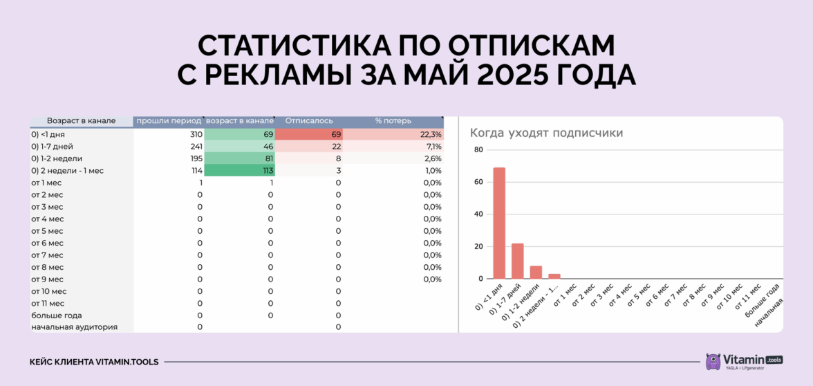Если пользователь забрал лид-магнит и отписался от бота, то продолжали коммуникацию с ним в канале. По статистике, большинство отписок из канала происходили в первые 24 часа — 22,3%. В течение первой недели отваливались ещё около 7% пользователей. После этого отписывались единицы.