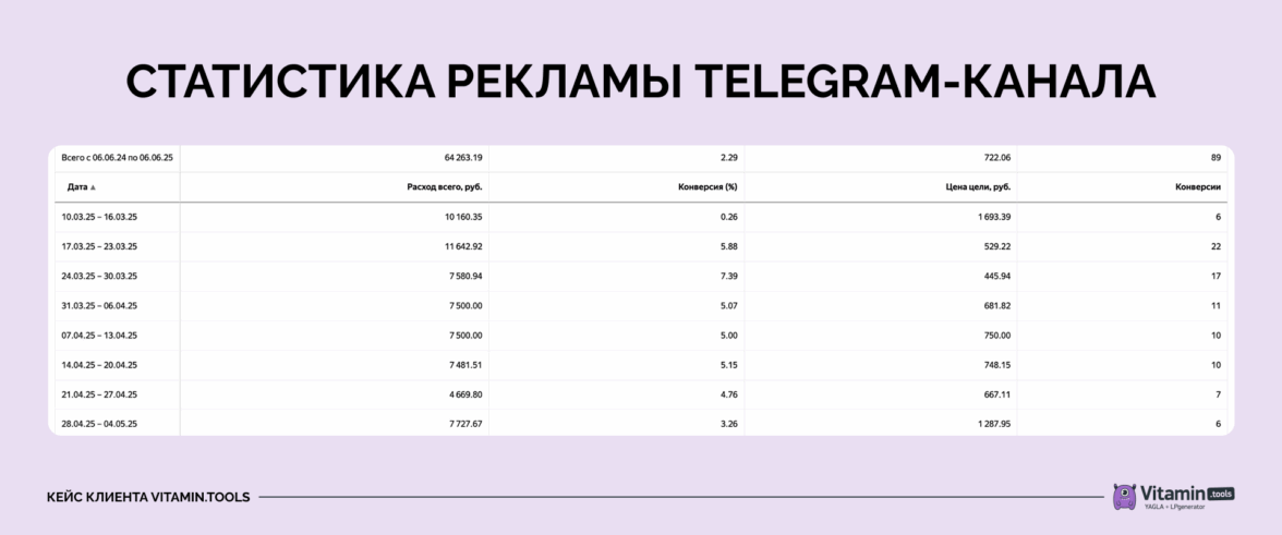 Запускаем рекламу через Директ. Он даёт точный таргетинг по интересам и позволяет обучать кампании на вступления в канал. При этом цена подписчика в Директе дешевле в 3–4 раз, чем в TG Ads и посевах.