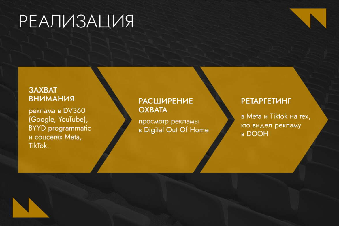 Для ретаргетинга использовались мобильные идентификаторы (IDFA и GAID), а не устаревшие Wi-Fi-ловушки. Это позволило точно определить пользователей и подключить их к Meta** и TikTok. Более половины аудитории видели и digital, и DOOH-рекламу — на них и сфокусировали ретаргетинг.