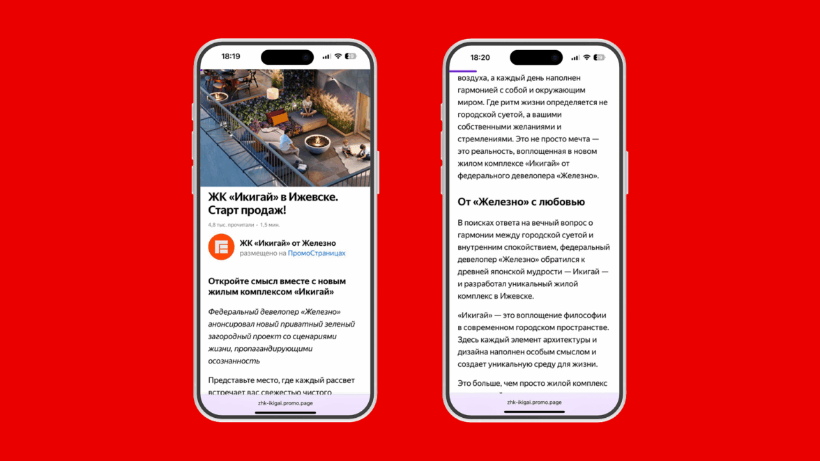 Для продвижения сделали одну ПромоСтраницу: «ЖК “Икигай” в Ижевске. Старт продаж!». В условиях ограниченного бюджета решили сосредоточиться на сильной, подробной статье, а не распыляться на несколько коротких материалов.