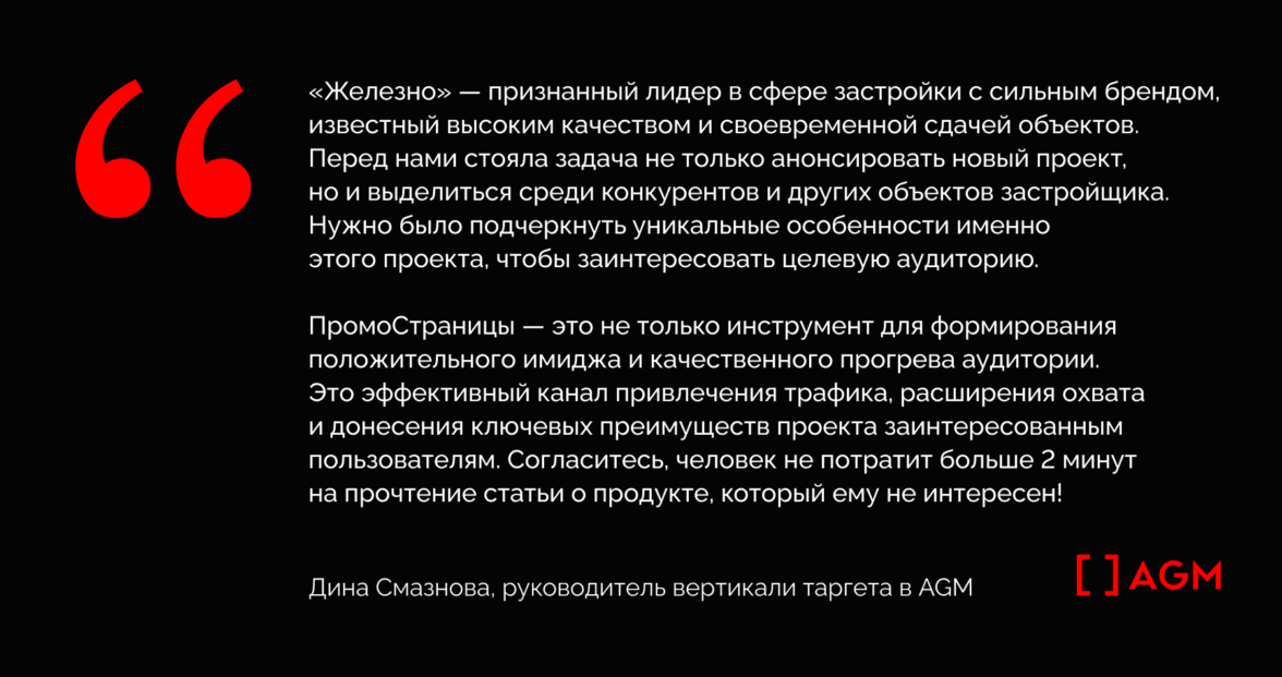 5. Узкий коридор коммуникации. Акцент сделали на ПромоСтраницу и визуал в ней — поэтому было особенно важно правильно подать жилой комплекс и настроить показы, чтобы обеспечить стабильный приток лидов.