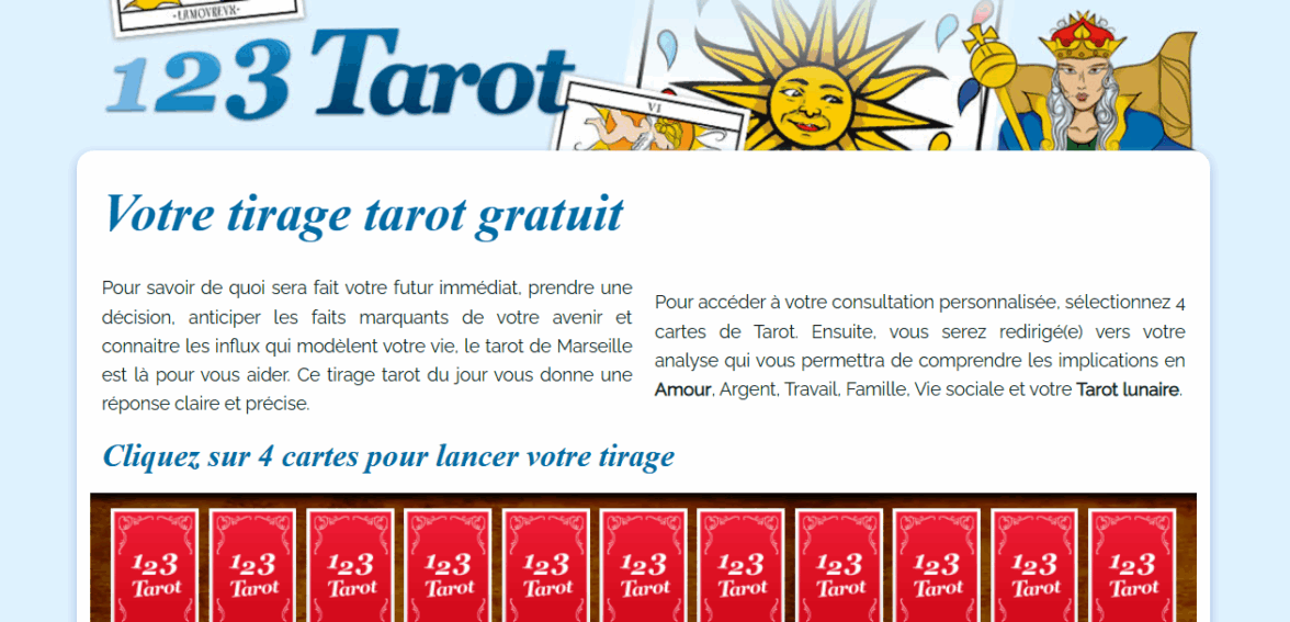 123Tarot специализируется на классическом марсельском раскладе. После бесплатной тройки карт пользователь может заказать персональный разбор, где астролог добавит лунный знак и диспозицию планет.