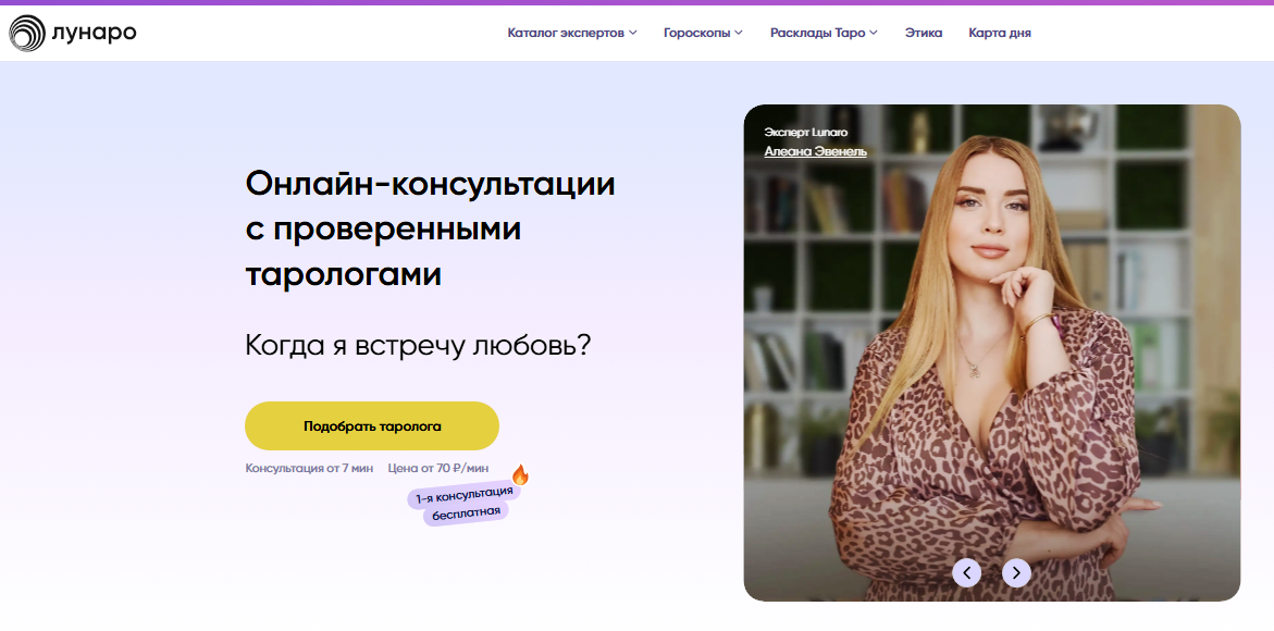 1. Lunaro — 1-я консультация онлайн бесплатно! Проверенные специалисты с ценой от 70 р/мин. Мгновенный чат, видео, экспресс-гороскоп, мобильное приложение.