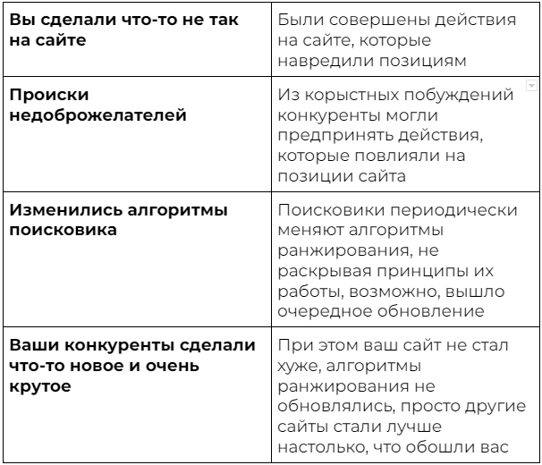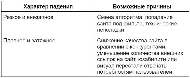 Бывает падение позиций резкое и внезапное и, наоборот, плавное и затяжное. Для начала нужно определить характер падения.
