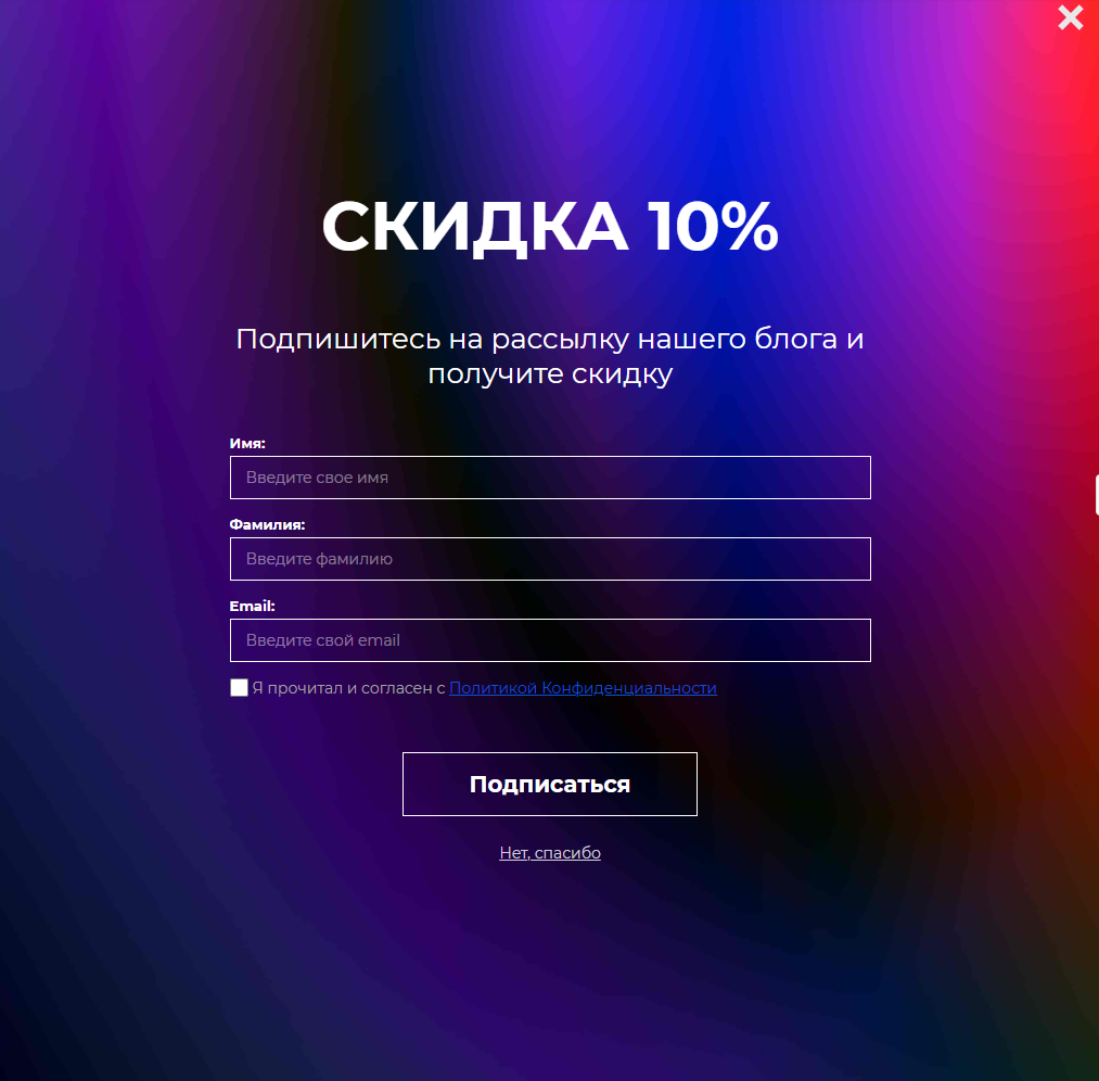 Предложение рассылки со скидками в pop-up окне