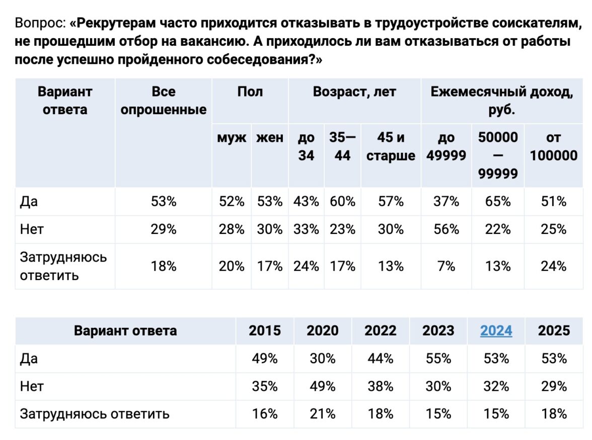 Сколько россиян отказывались от предложения о работе после успешно пройденного собеседования