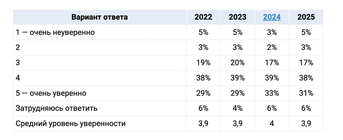 3,9 балла по 5-балльной шкале — таков средний уровень уверенности россиян на интервью с работодателем, — показал опрос SuperJob. 31% опрошенных заявили, что чувствуют себя очень уверенно (5 баллов). 38% респондентов поставили себе 4 балла, 17% — 3 балла, 3% — 2 балла. Каждый двадцатый (5%) заявил, что чувствует себя очень неуверенно (1 балл). Год назад при проведении аналогичного опроса средний балл был чуть выше — 4 балла ровно, в 2023 и 2022 годах — такой же, как сейчас.