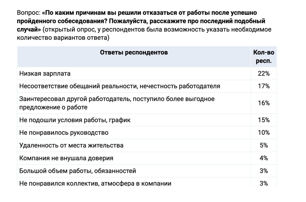 Причины отказа соискателей от работы после успешно пройденного интервью