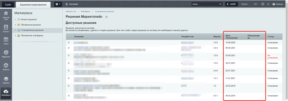 В этом разделе нас интересуют все сторонние решения, установленные на сайте. Их необходимо также обновить. Конечно, есть платные и бесплатные решения. Бесплатные обновляем, а на платных смотрим срок поддержки активен или нет. Если нет, то каждое решение необходимо продлить. Условия продления могут быть разными, но обычно это 50% от стоимости решения. Подробнее вы можете посмотреть на странице Маркетплейса, кликнув по названию этого решения.