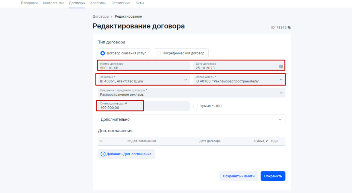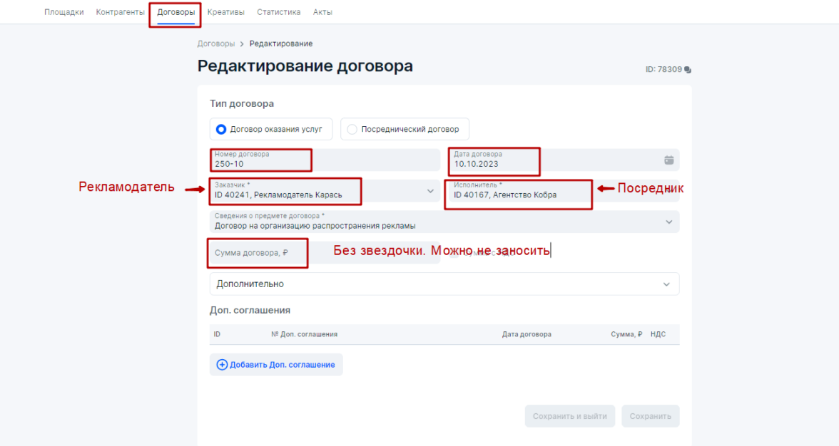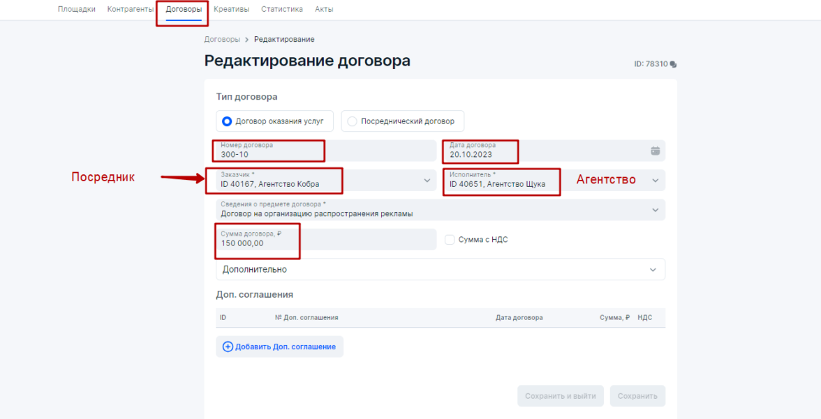 3. Агентство укажет договор с атрибутами (номер, дата, сумма договора необязательна) точь-в-точь из бухгалтерского (бумажного) договора №200–10 от 20 октября 2023 года в блоке Договоры. Если стороны не используют договор, то в поле Номер договора можно вписать номер счета, счет-договора либо счета-оферты (Роскомнадзор это не запрещает), однако наличие договора между сторонами при маркировке рекламы более приоритетно, чем иные первичные документы, подтверждающие факт сделки между контрагентами.