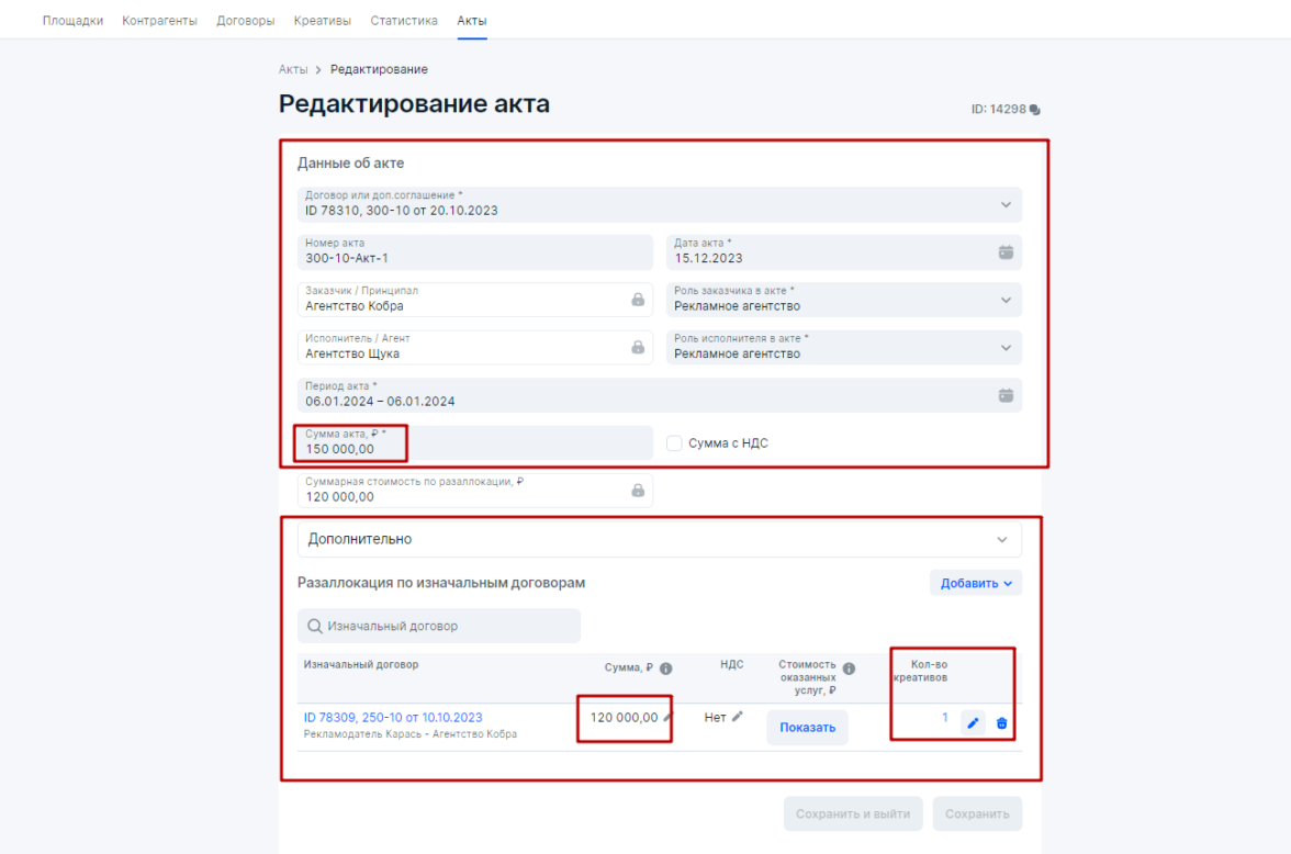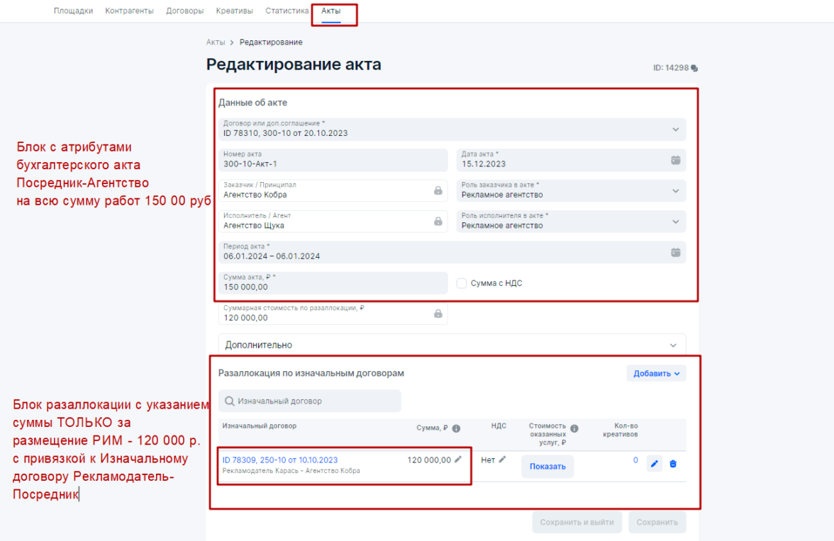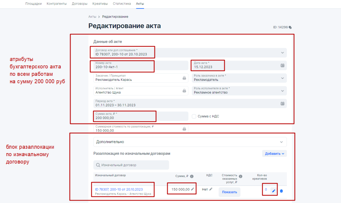 При этом, в блоке Акты Агентство по гибридному вариантузаполнит верхнюю часть на основании своего бухгалтерского бумажного акта. А также произведет разаллокацию по Изначальному договору БЕЗ добавления данных по креативам, т.е. в стобике Количество креативов должен фигурировать 0 и на Карандашик нажимать не требуется.