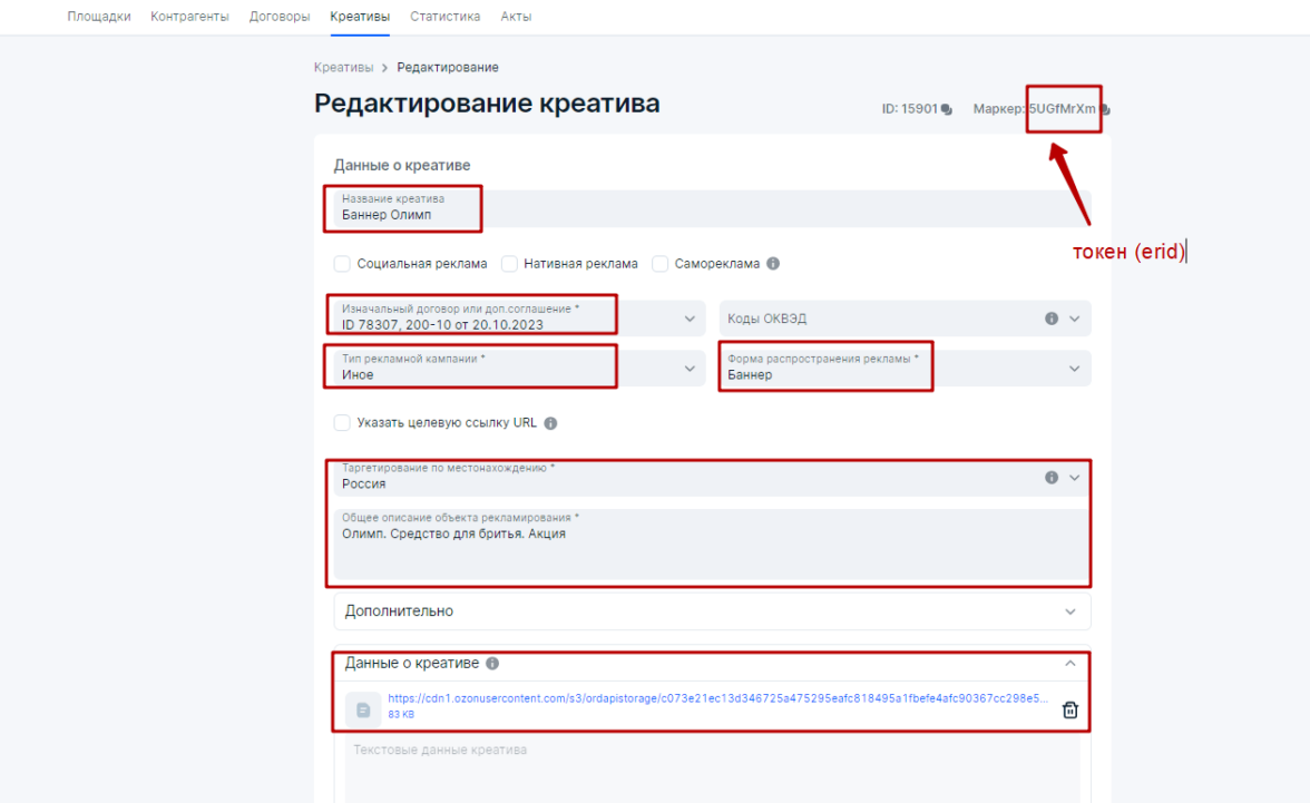 4. Далее Агентство загрузит креативы и получит токен в блоке Креативы. Например, креативом будет баннер Олимп в качества РИМ (рекламно-информационный материал).