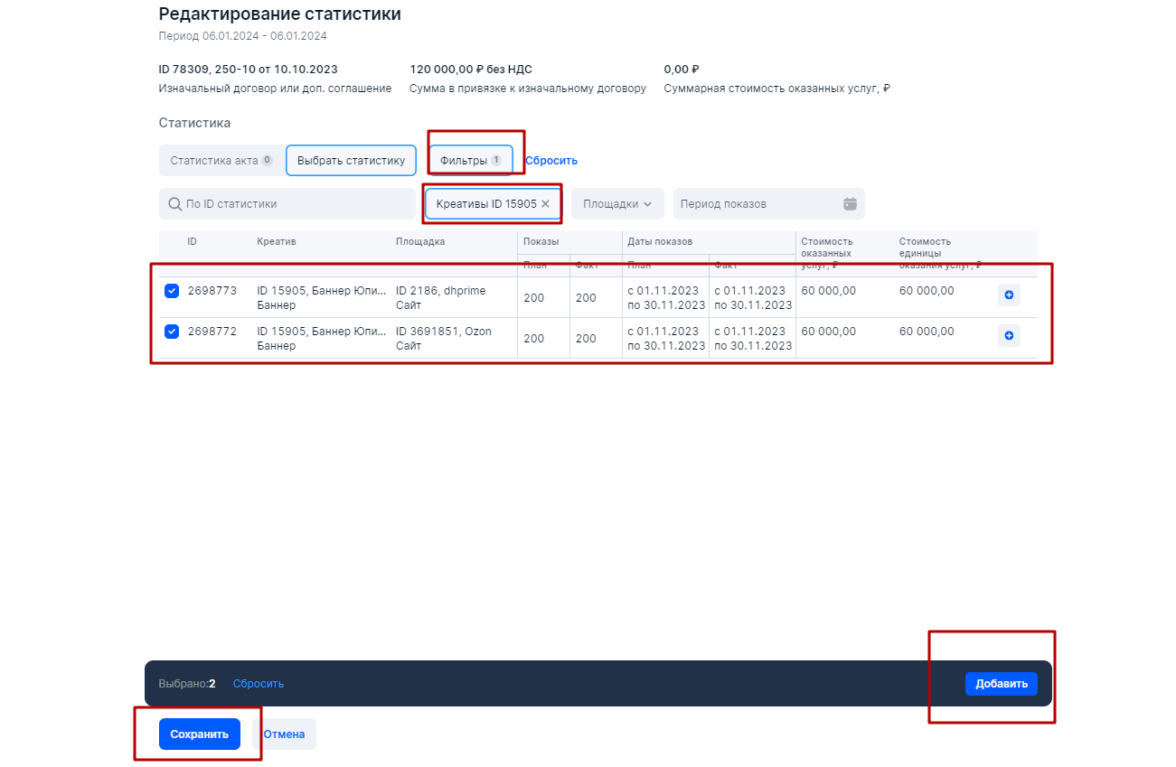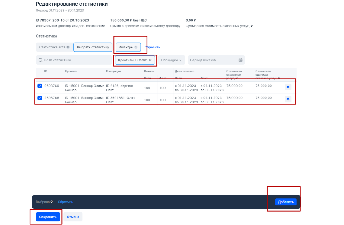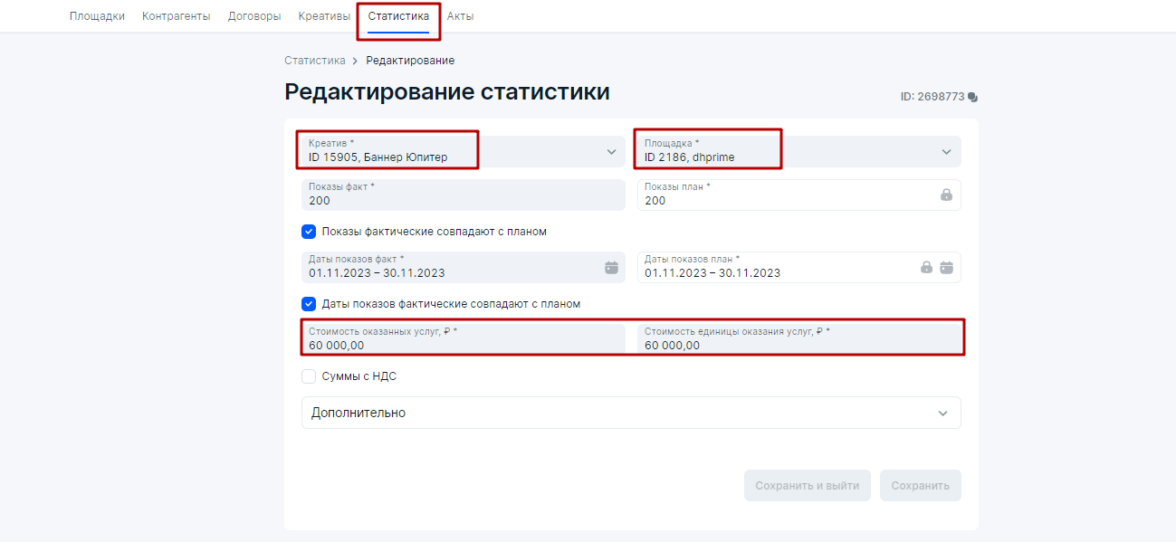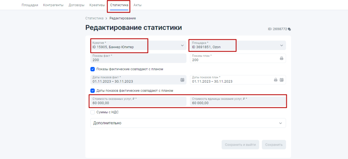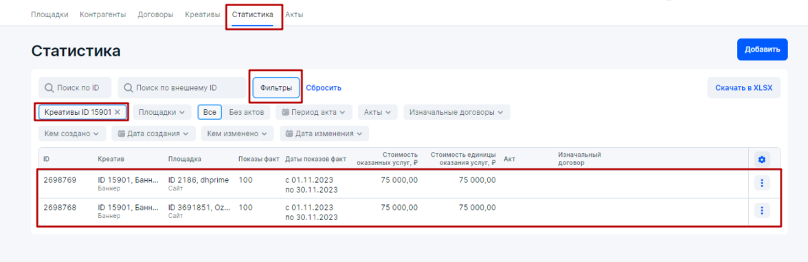 Если бы у нас было два креатива и одна площадка, то также в блоке Статистика у нас было бы две строчки — каждая строчка для отдельного креатива, но на единой площадке. Если бы у нас было два креатива на двух площадках, то в блоке Статистика присутствовало бы четыре строчки. Это и есть разаллокация (детализация), которую требует Роскомнадзор при построении отчетов и актов в ОРД.