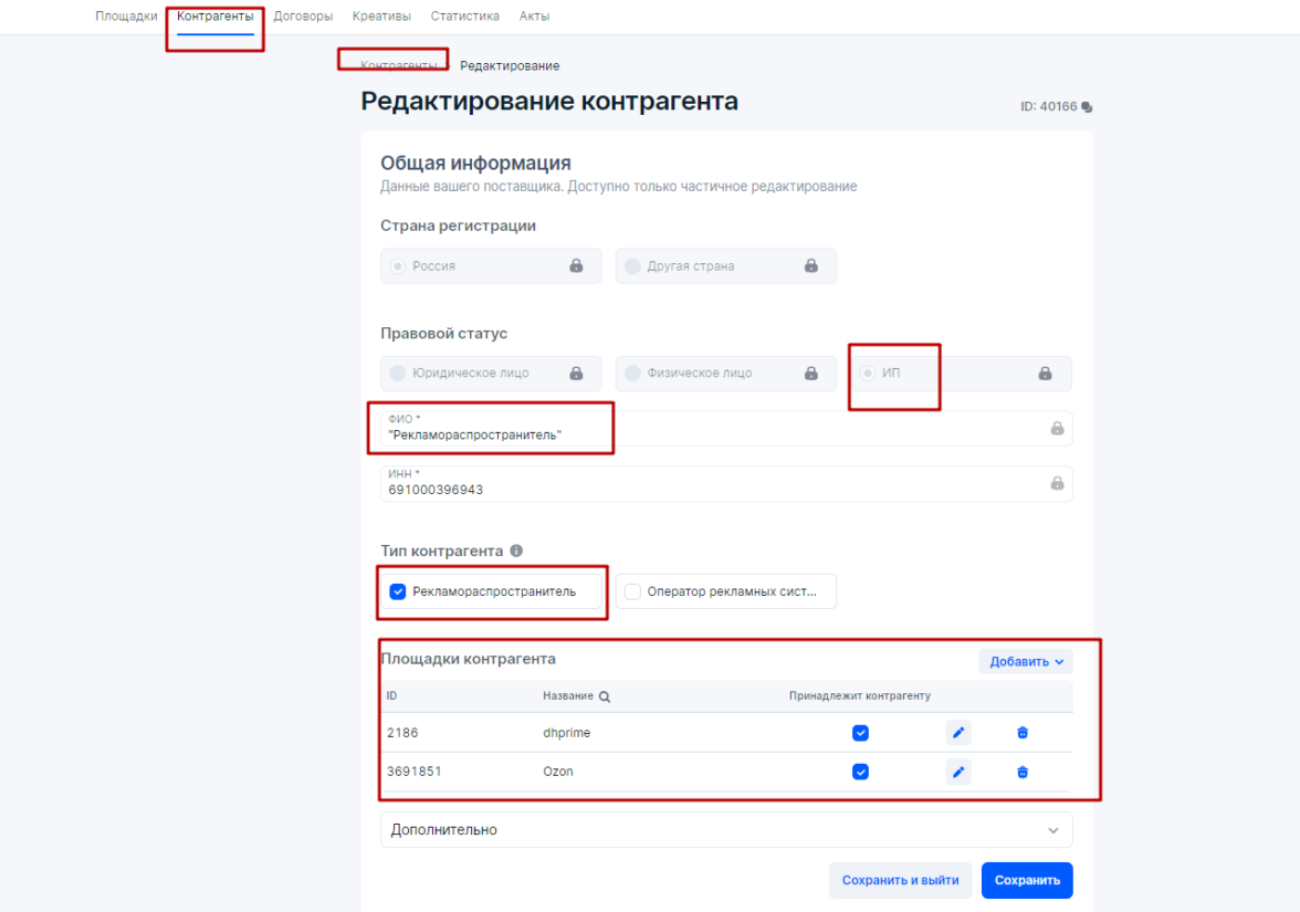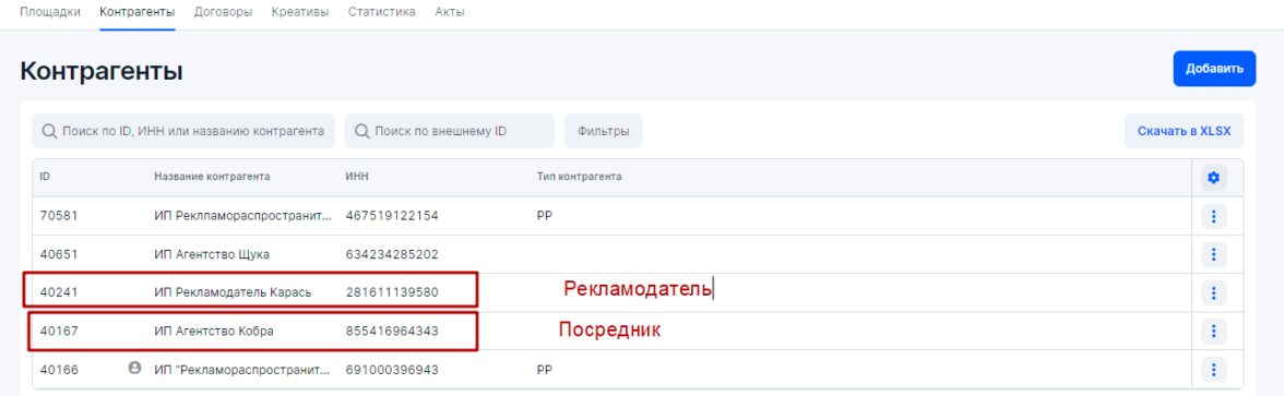 Внести Контрагентов для договора Рекламодатель — Посредник в блоке Контрагенты;
