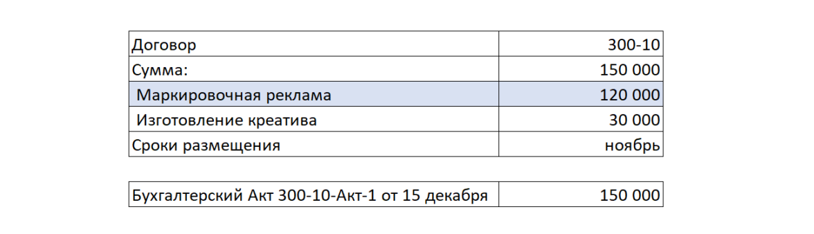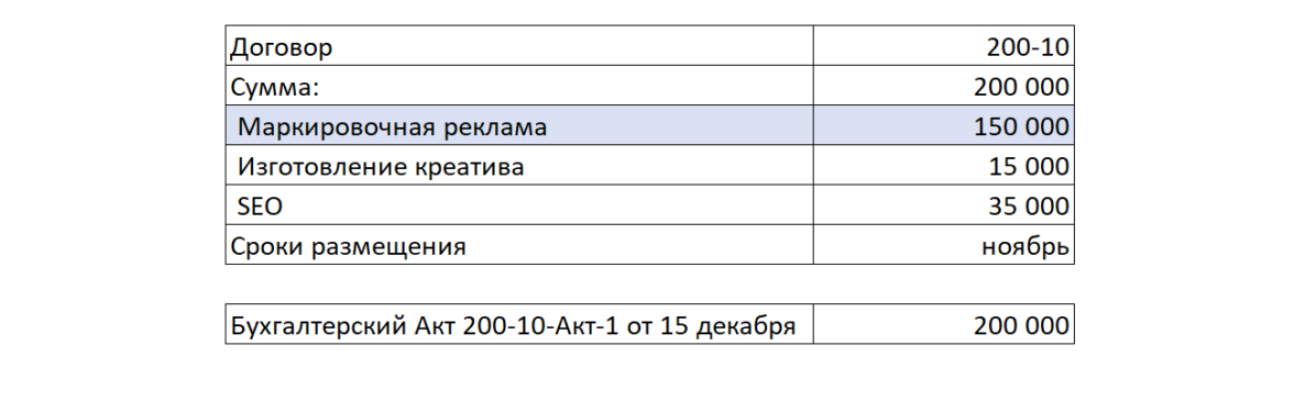 Изначально предположим, что между Рекламодатель и Агентство есть договор 200–10 от 20 октября на размещение рекламных материалов в ноябре 2023 года и дополнительным работам по договору (креатив и SEO). Рекламодатель оплатил услуги Агентства 10 декабря. Агентство выставит для Рекламодателя бухгалтерский (бумажный акт) 200–10-Акт-1 от 15 декабря 2023 года на общую сумму работ по договору в размере 200 000 рублей.