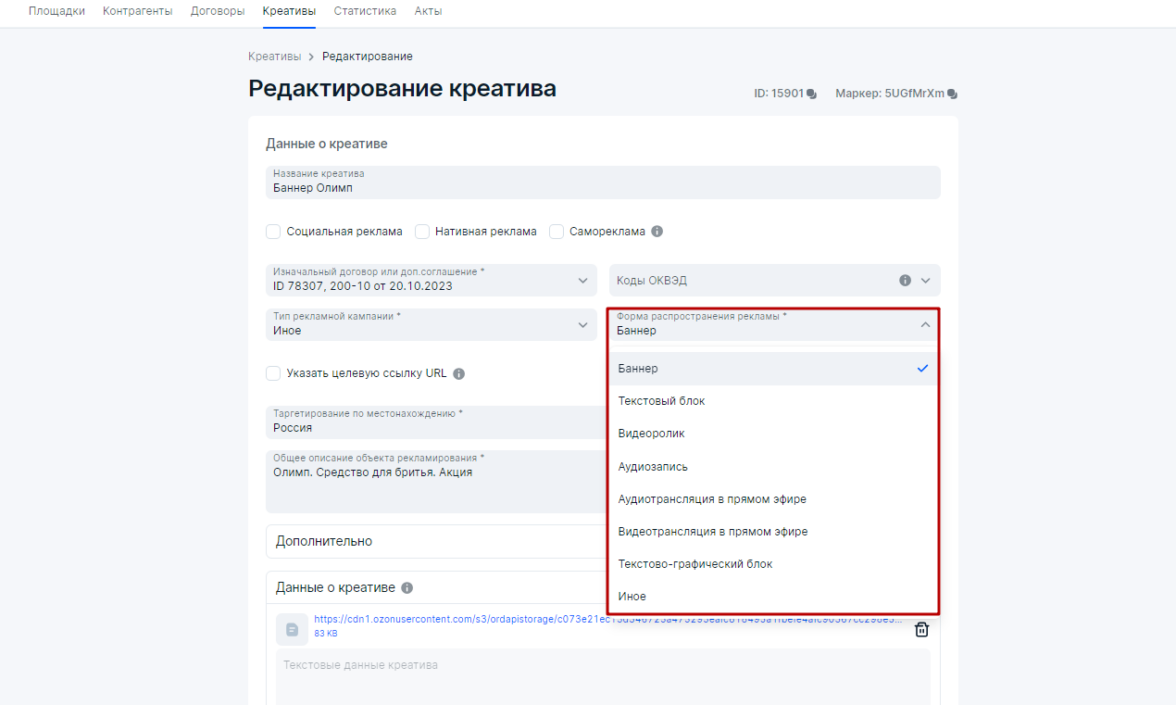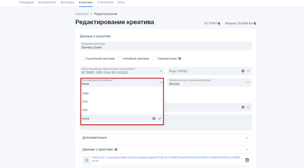 Стоит заметить, что все ОРД (оператор рекламных данных) имеют свою специфику в плане оформления интерфейса, но все они выполняют единые требования ЕРИР (единый реестр интернет-рекламы).