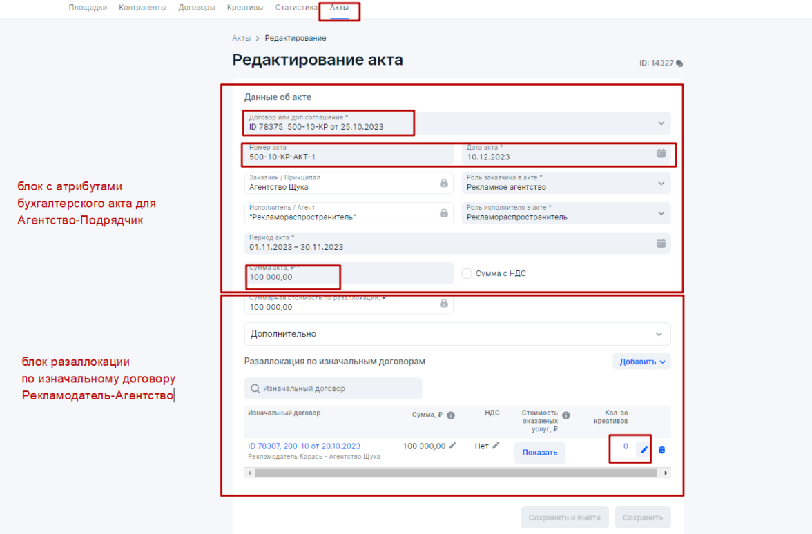 При этом, в блоке Акты Агентство по гибридному варианту заполнит верхнюю часть на основании своего бухгалтерского бумажного акта. А также произведет разаллокацию по Изначальному договору БЕЗ добавления данных по креативам, т.е. в стобике Количество креативов должен фигурировать 0 (ноль) и на Карандашик нажимать не требуется.