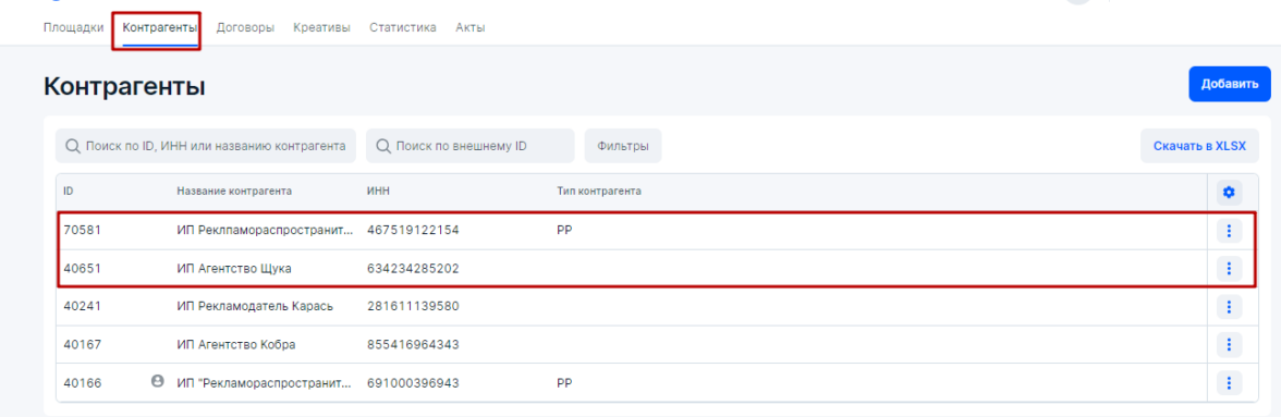 2. Агентство в блоке Контрагенты укажет данные контрагентов (требуется ИНН) по вышеуказанному договору №200–10 от 20 октября 2023 года — себя, как Агентство Щука в статусе ИП и Рекламодателя, как Рекламодатель Карась в статусе ИП.