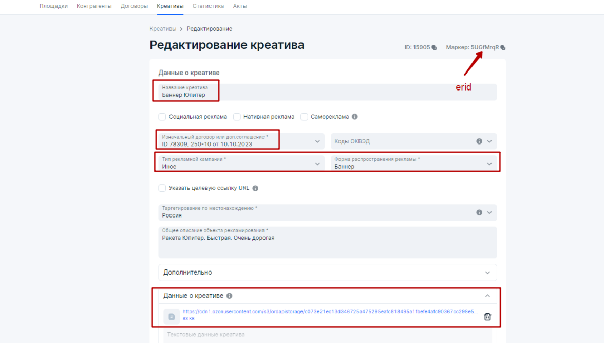 6. Агентство Щука загрузит в свое ОРД креативы (баннер Юпитер) и получит токены для РИМ в блоке Креативы с прикреплением к Изначальному договору (договор Рекламодатель — Посредник).