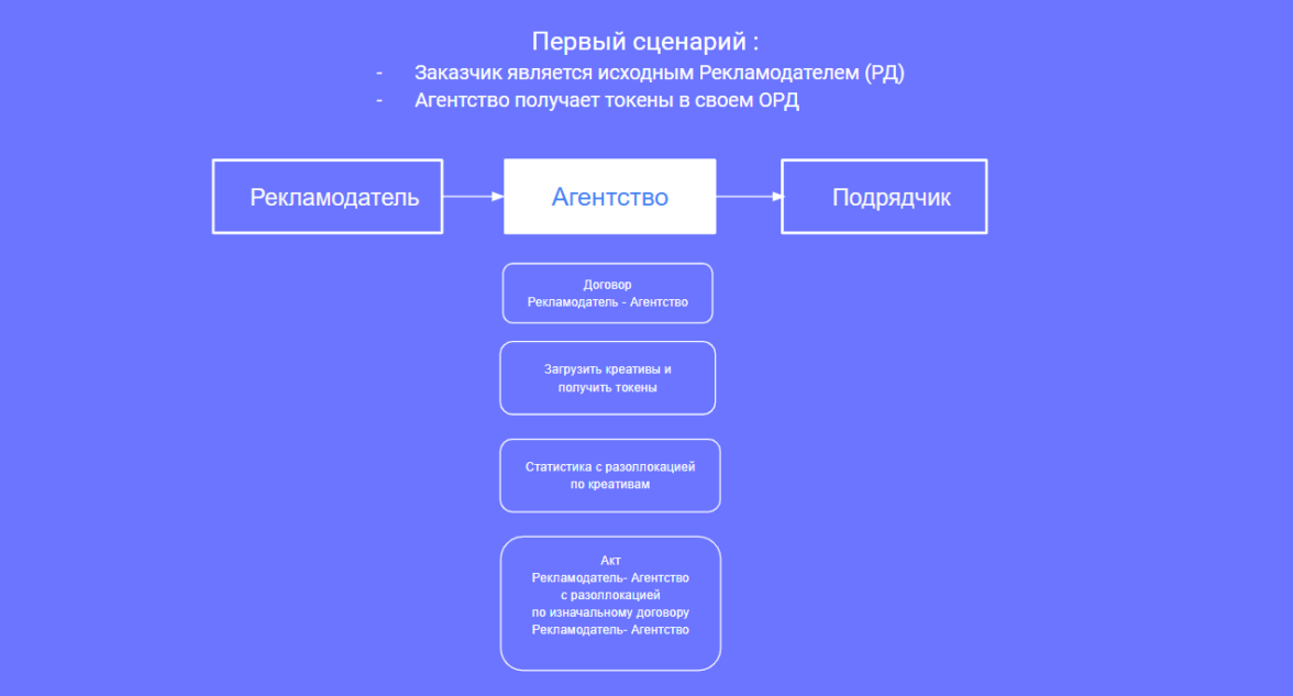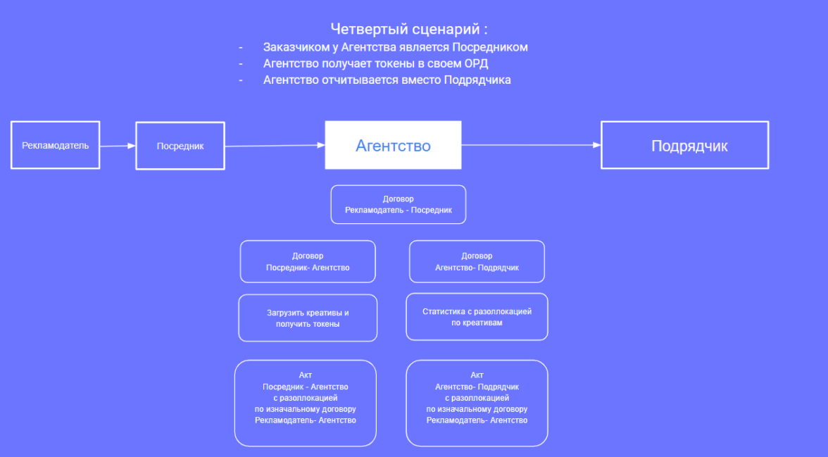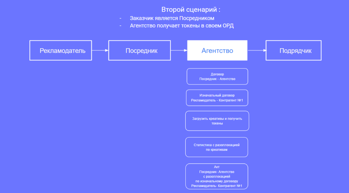 Также стоит заметить, что возможен гибридный вариант для Второго сценария, где Сторонами была заключена договоренность, оформленная в договоре, что обязанность произвести отчетность в своем ОРД за связку (договор) между Посредник-Агентство возьмет на себя Агентство, нообязательства получить токены в своем ОРД возьмет на себя Посредник либо иной участник рекламной цепочки.